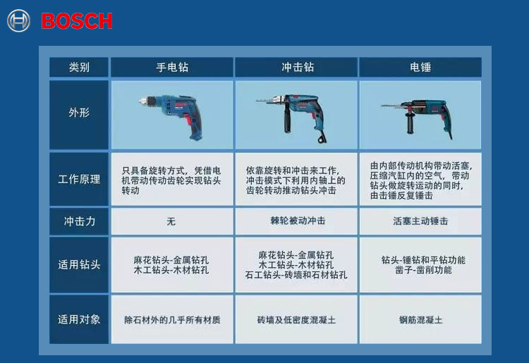 首頁>五金資訊>常見問題>亮河電工工具小知識-博世手電鉆、沖擊鉆、電錘、傻傻分不清楚?